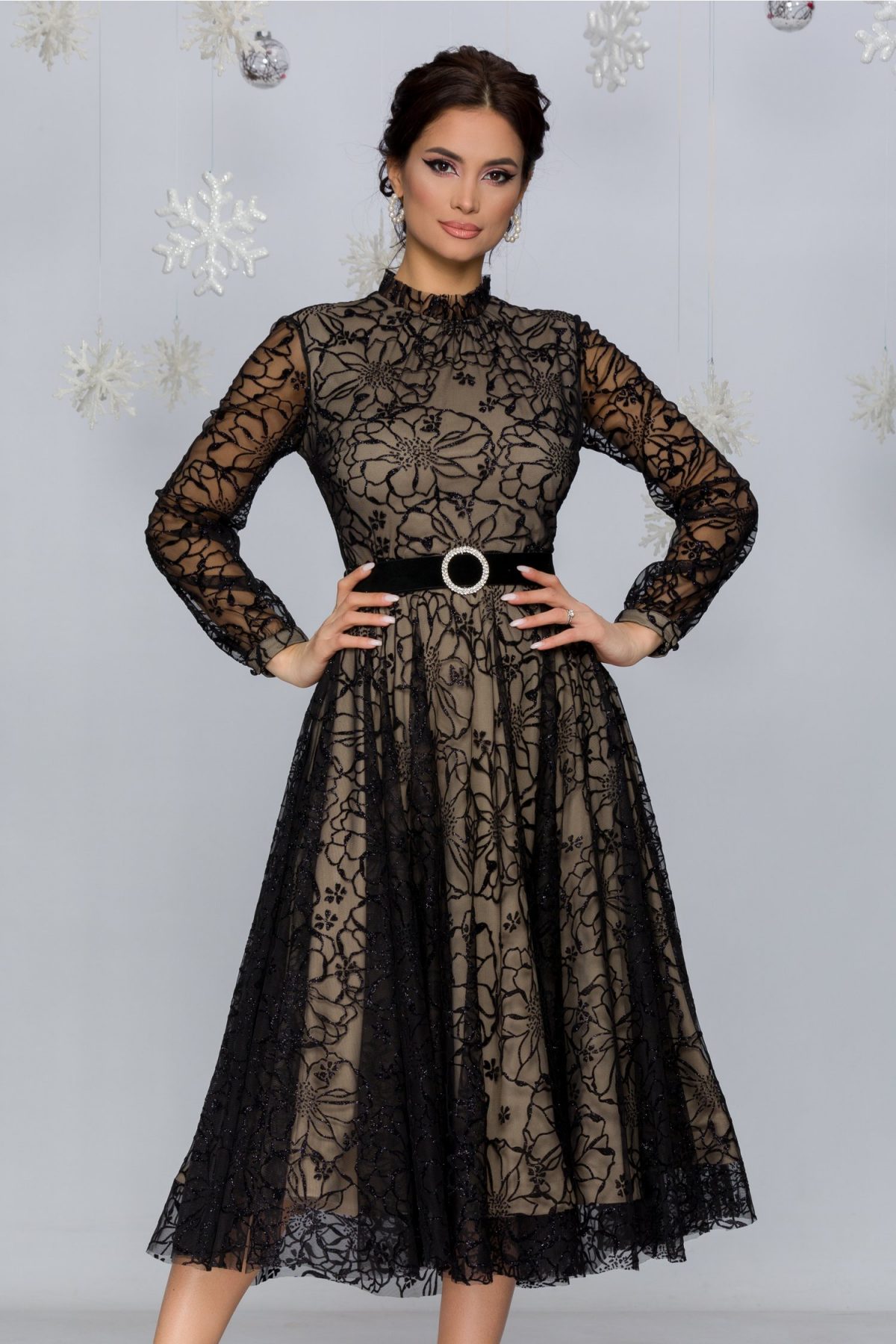 Rochie Kasya neagra cu captuseala bej accesorizata cu insertii florale din catifea si glitter. Pret: 179.99 lei. Se poate cumpara de aici: