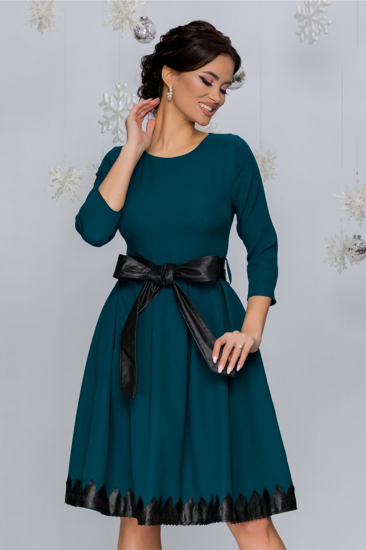 Rochie Loraine turcoaz cu detalii din piele. Pret: 179.99 lei. Se poate cumpara de aici: