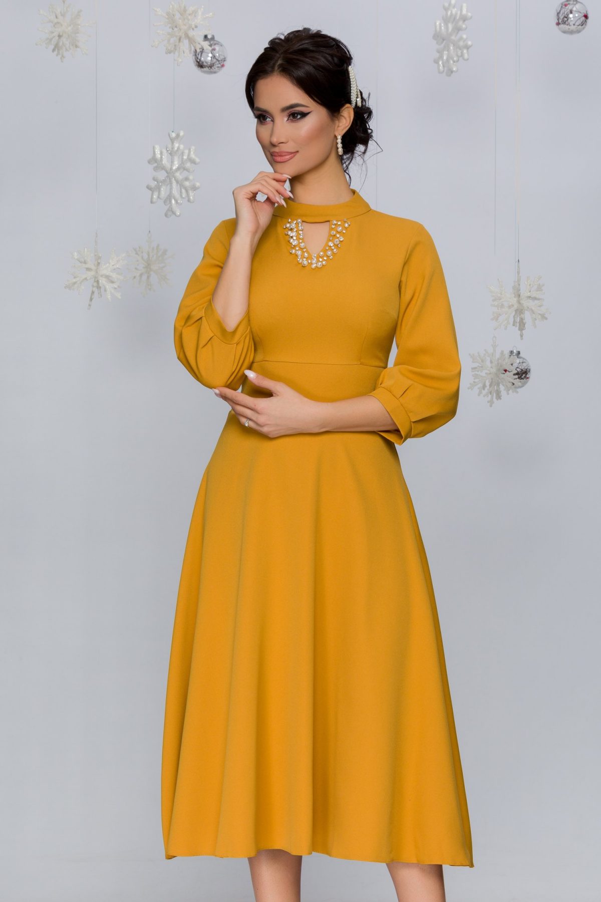 Rochie Carmen galben mustar cu decolteul decorat cu perlute si strasuri. Pret: 199.99 lei. Se poate cumpara de aici: