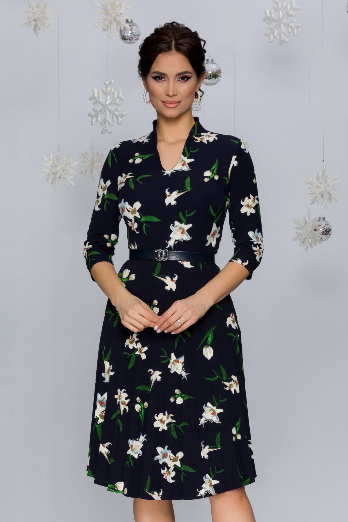 Rochie Celinda bleumarin cu imprimeu floral beige. Pret: 229.99. Se poate cumpara de aici: